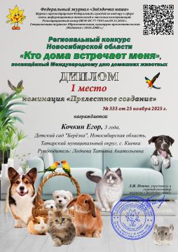Воспитанник младшей группы Кочкин Егор,занял 1 место в региональном конкурсе Новосибирской области "Кто дома встречает меня", посвященный Международному дню домашних животных. Поздравляем победителя! Молодец.