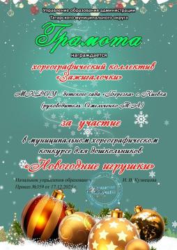 Грамота за участие в муниципальном хореографическом конкурсе "Новогодние игрушки".